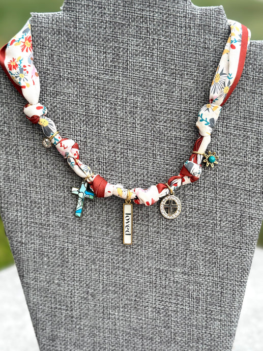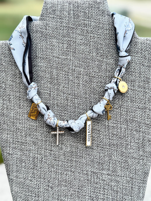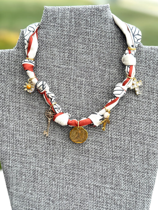 Bringing the hottest trend to your accessory game, the bandana charm necklace features a self-tie closure, allowing you to adjust to your neckline.  Each one is designed with you in mind playing into attractive colors and stories through print and charm design.