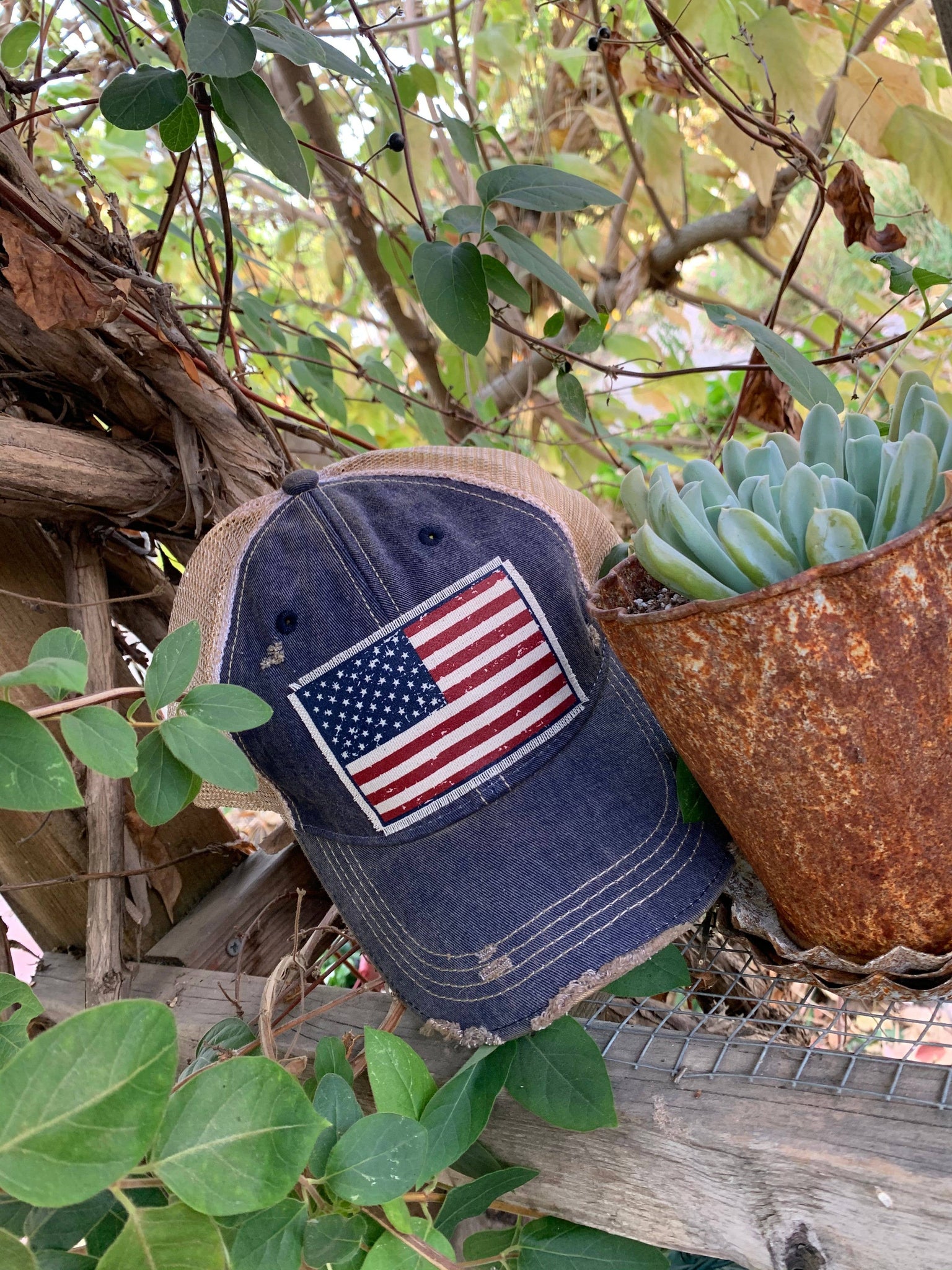 American Flag USA vintage distressed trucker cap. Color: Navy Blue distressed. Material: cotton/polyester blend, mesh back. Size: one size fits most, with an adjustable snapback strap. Unisex cap.