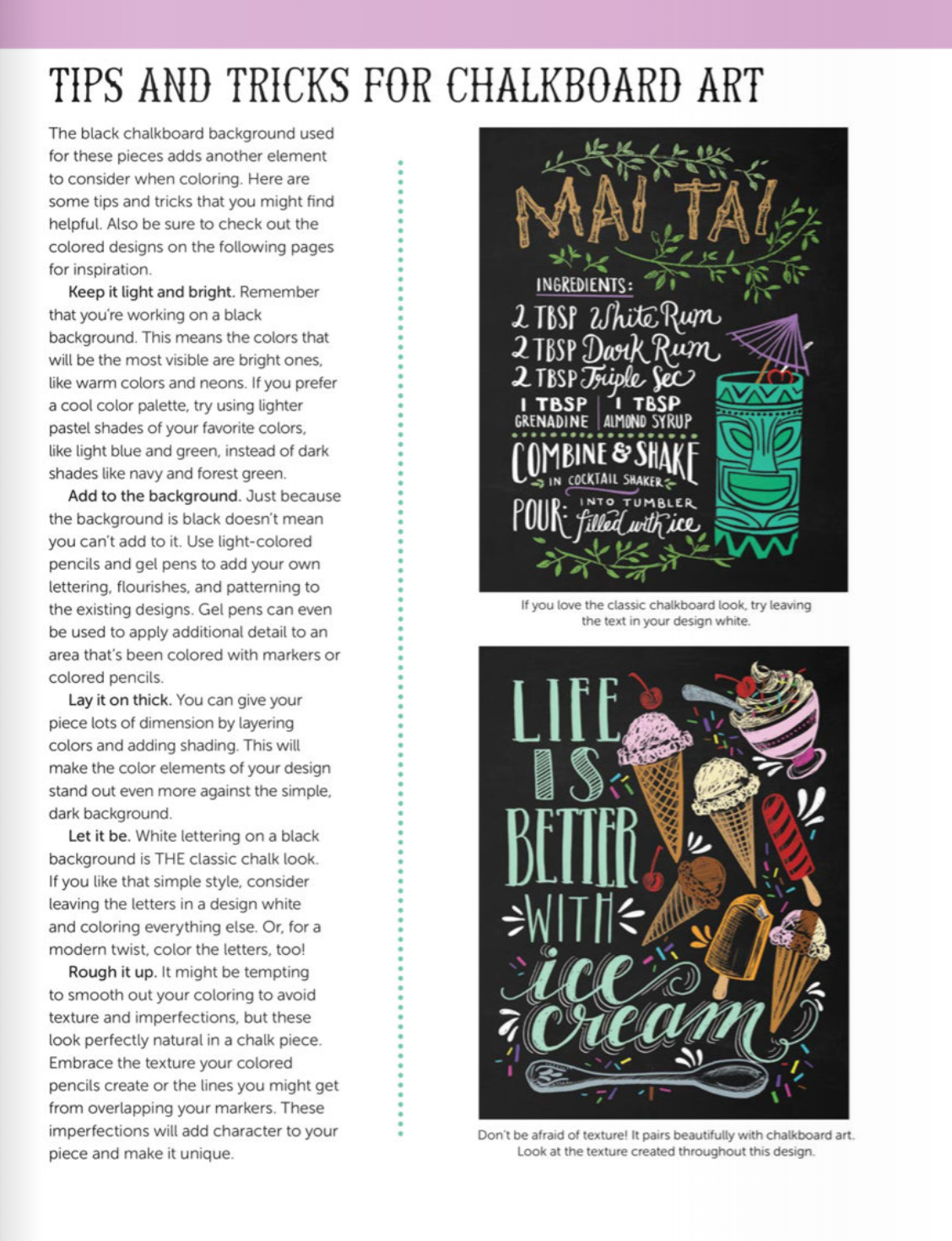 Hand-drawn designs of chalkboard art. Whimsical white line illustrations on black backgrounds. Use markers, colored pencils or gel pens. Artwork by Valerie McKeehan. Paperback. 80 pages. Pre-priced $9.99
