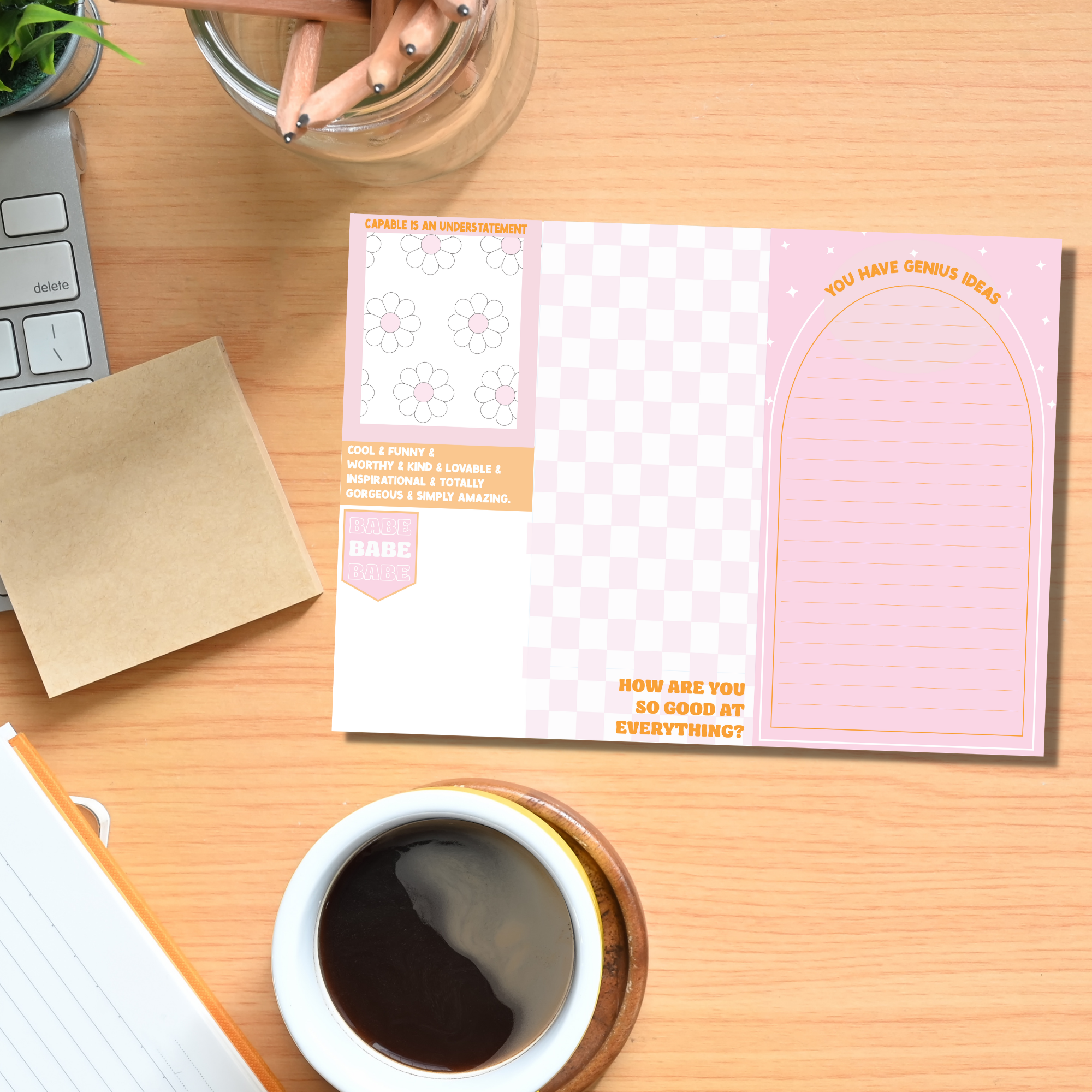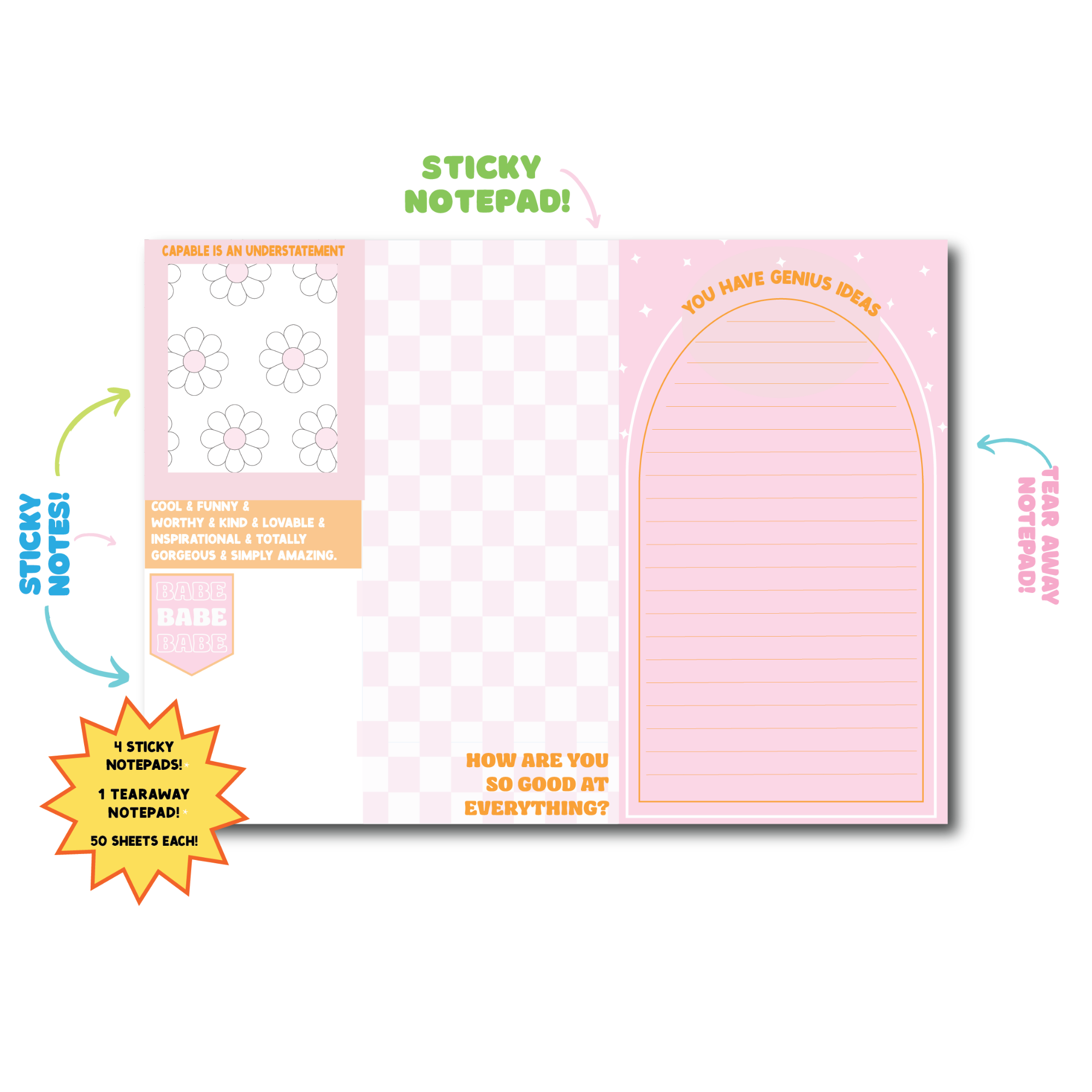 The ultimate notepad set! A total of 5 different notepads all in one convenient set. 1 tear away notepad, 1 sticky list note pad, 2 square sticky note pads, and 1 small tab sticky notepad. 50 sheets each. These come packaged in a clear poly sealed bag.