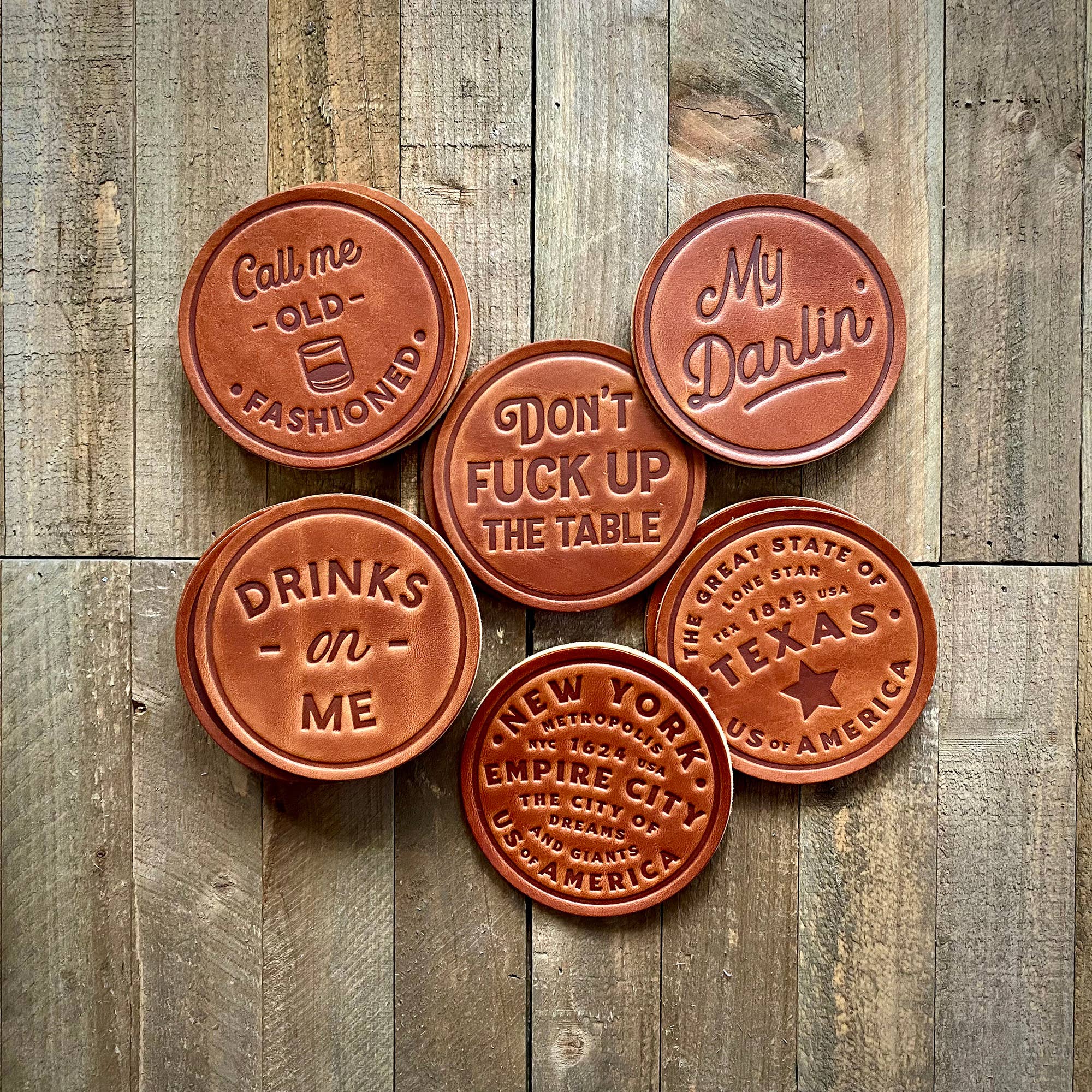 Our leather coasters are cut and pressed by hand from some of the thickest and finest harness leather available. They patina beautifully as they age. Customers love the ability to mix and match a variety of styles to make a classic set of coasters that really says, "I picked these out just for you!"