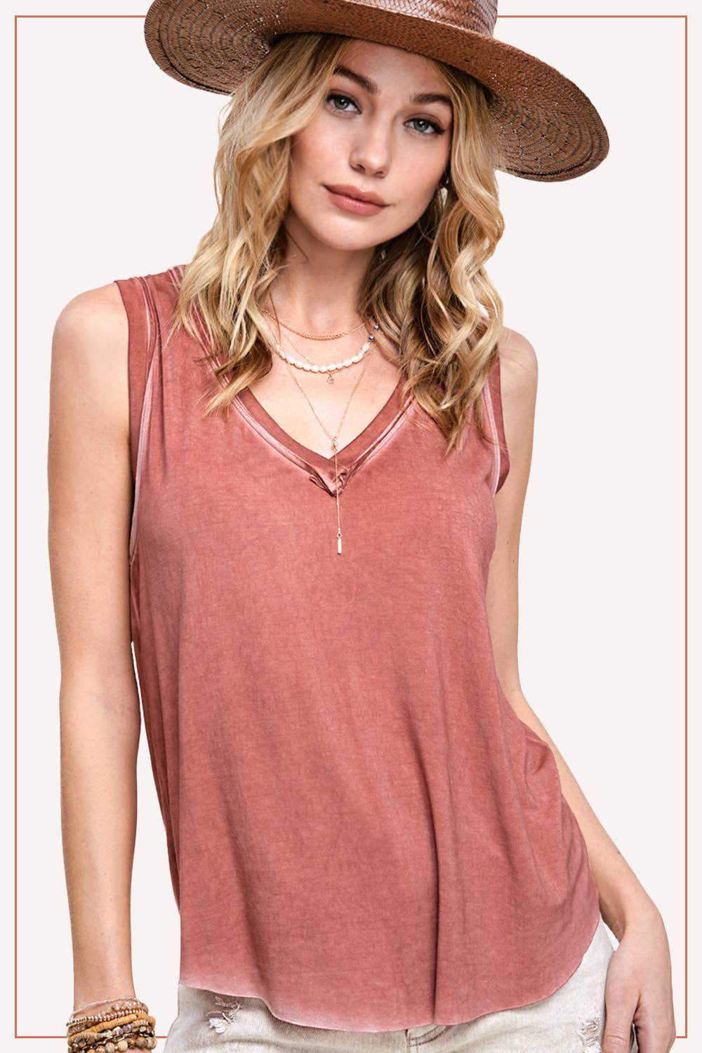 Dyed fabric sleeveless top with V-neck and back spine raw hem with box X stitch on the back. We highly recommend to wash seperately since this is garment dyed.