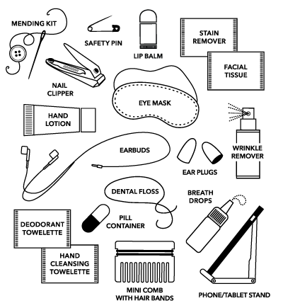 Bring your own business class with a Travel Kit by Pinch Provisions. Designed for minimum space and maximum in-flight comfort, the periwinkle vegan leather pouch contains 18 travel essentials - mending kit, nail clipper, safety pin, lip balm, stain remover towelette, facial tissue, hand lotion, eye mask, earbuds, earplugs, wrinkle remover, deodorant towelette hand cleansing towelette, pill container, dental floss, mini comb, hair bands, breath freshener and phone/tablet stand.