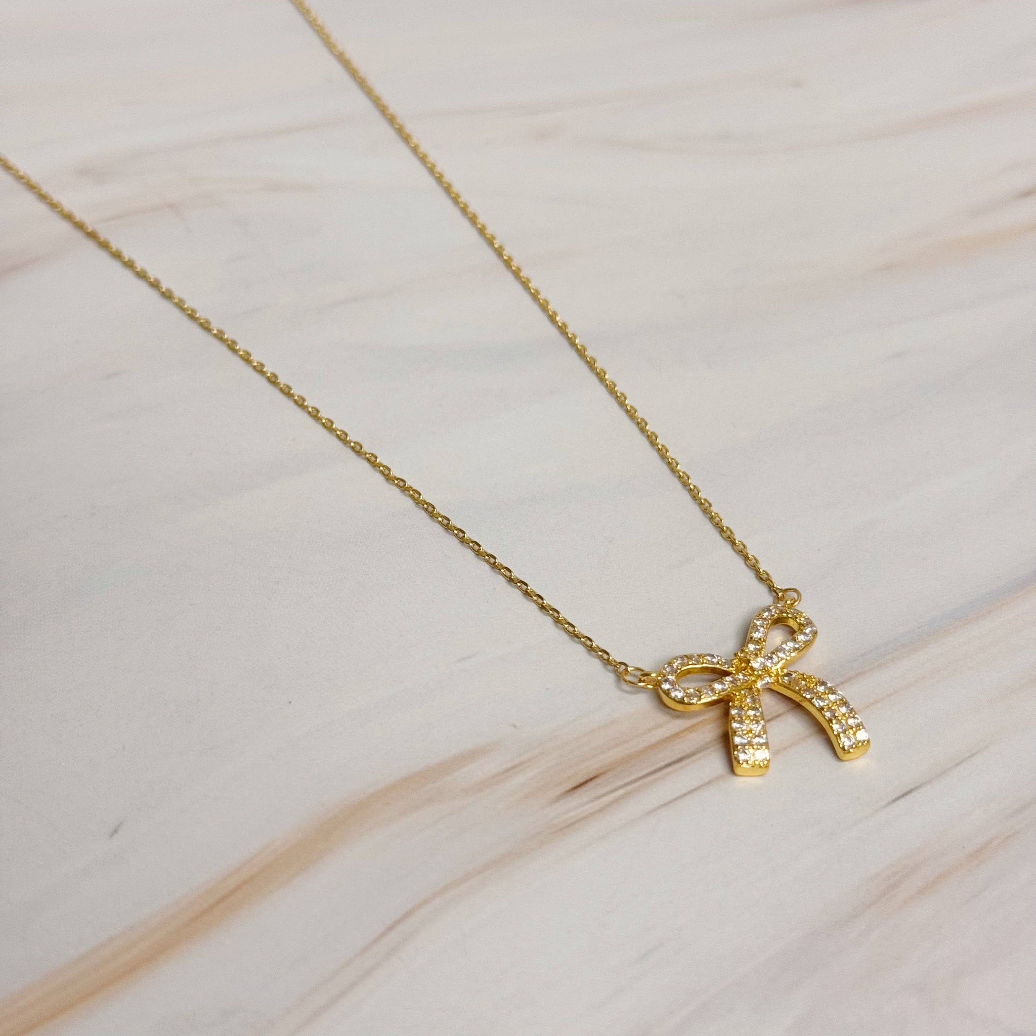 Introducing the Simply Shine Bow Necklace, the perfect accessory for those who value simplicity and elegance. With its delicate and dainty bow design, this necklace adds a touch of sophistication to any outfit. Its subtle shine adds just the right amount of sparkle. 16" chain with a 2" extender 18k gold plated Brass Cubic Zirconia. Lead and Nickel free.
